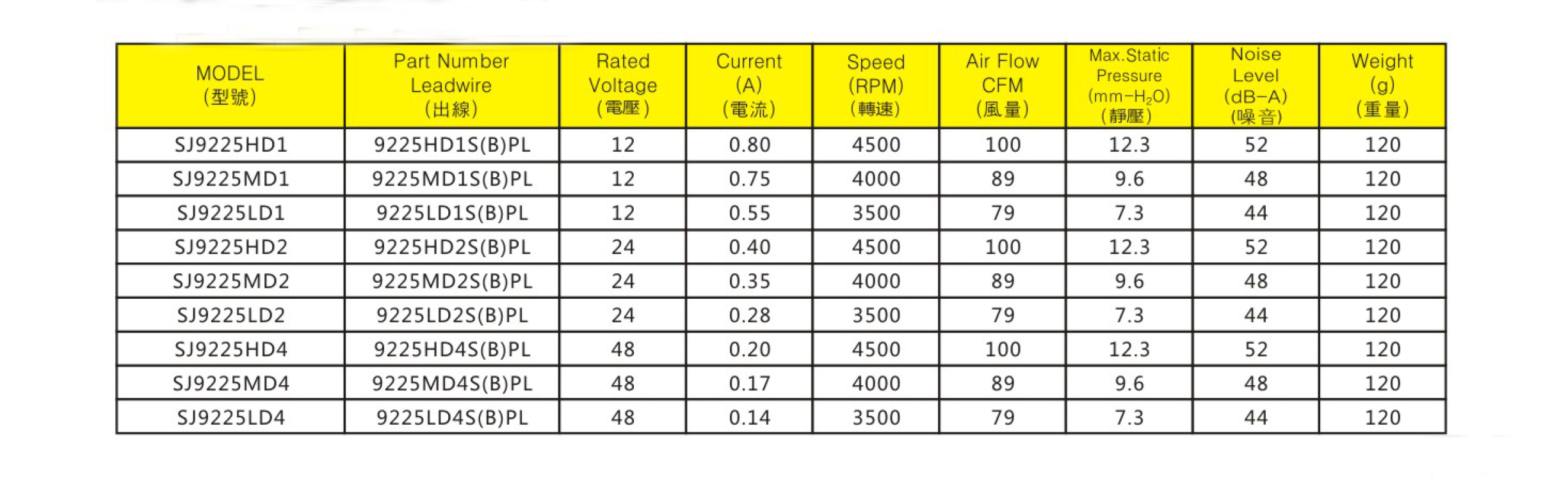 尺寸:92x92x25mm 框架: UL94V-0 PBT 軸承: 含油軸承& 雙滾珠軸承 電壓:DC 5V 12V 24V 48V 壽命:50 000Hours at 25℃--滾珠軸承 30 000Hours at 25℃--含油軸承 工作溫度:-20℃~70℃ 正常濕度 儲存溫度:-20℃~85℃ 正常濕度